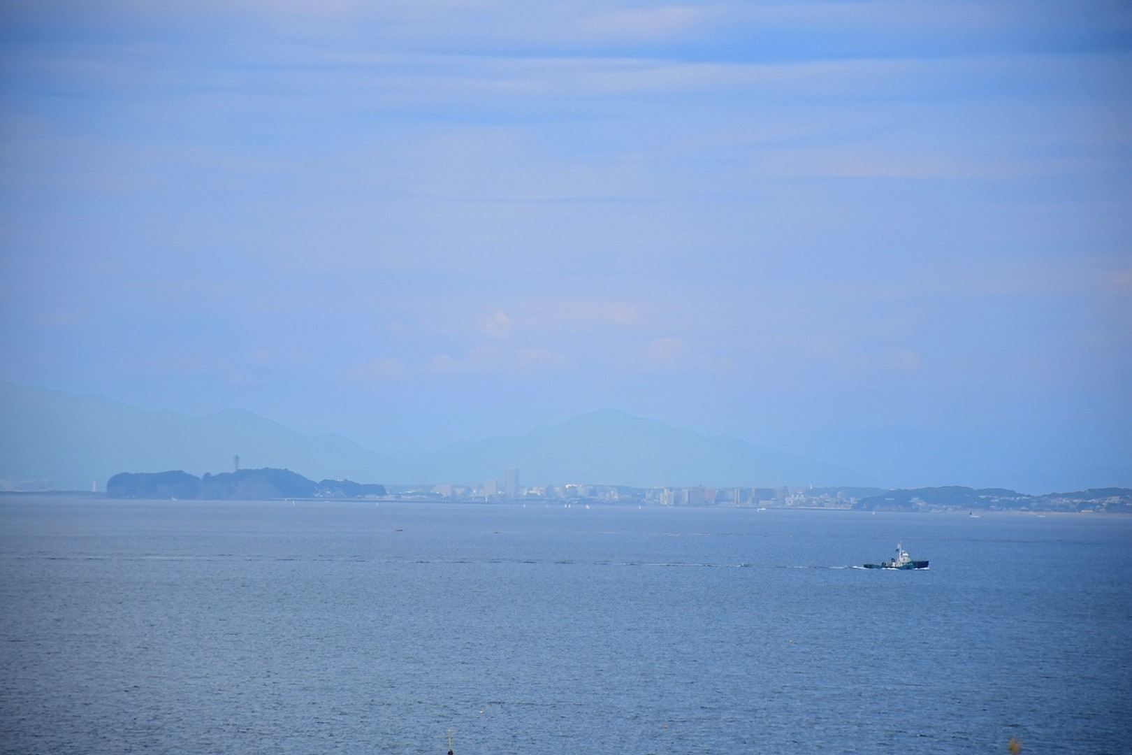遠く、江ノ島が見える。今日も高曇りで富士山は見えなかった。