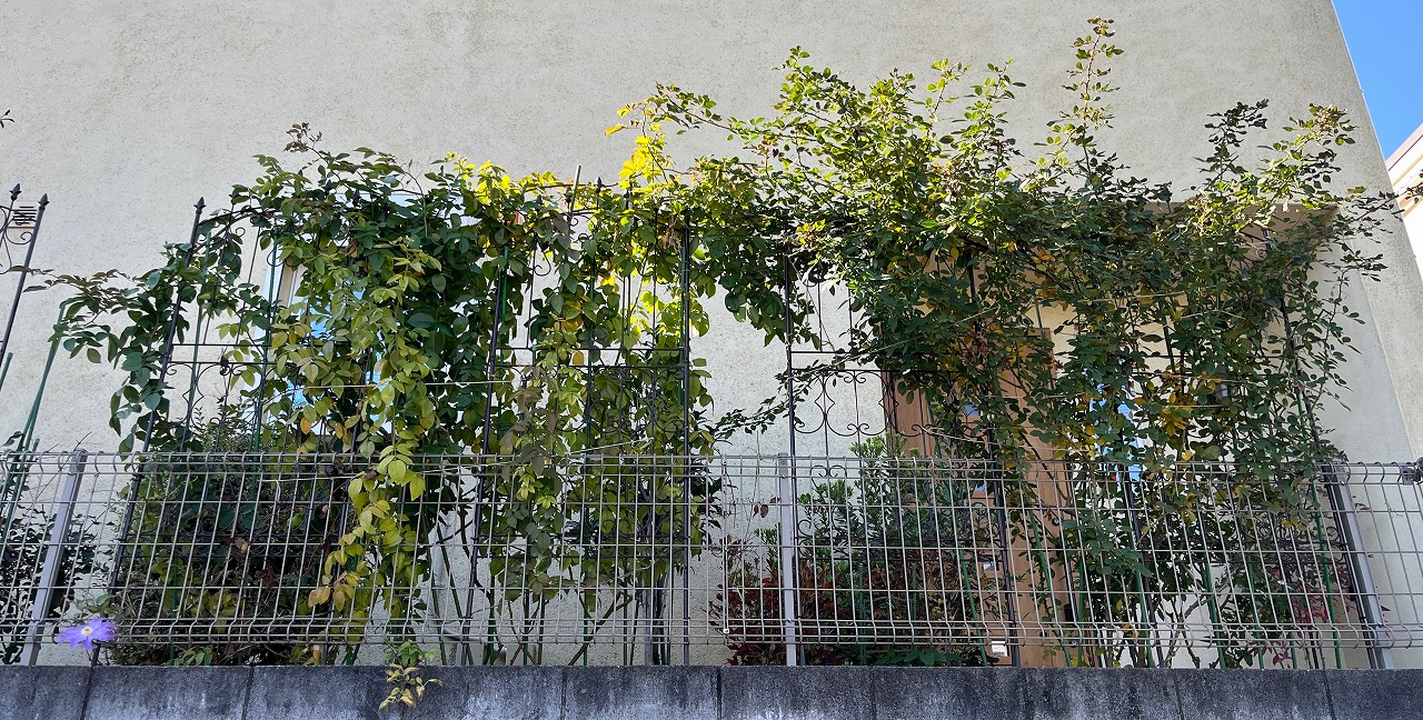 その第一弾としてつるバラ、シュラブの剪定前の準備を始めた。全ての葉を手で落としてバラの休眠を促す。今日はマリーヘンリエッタをやることにした。