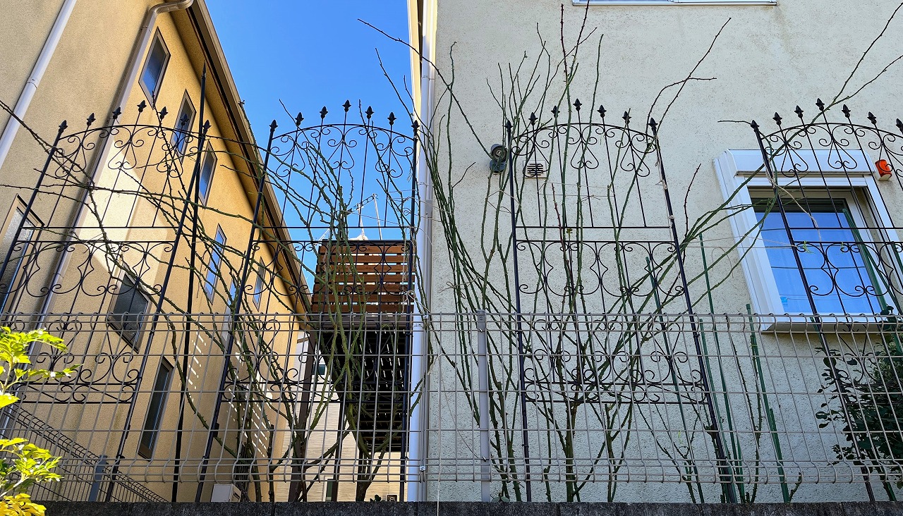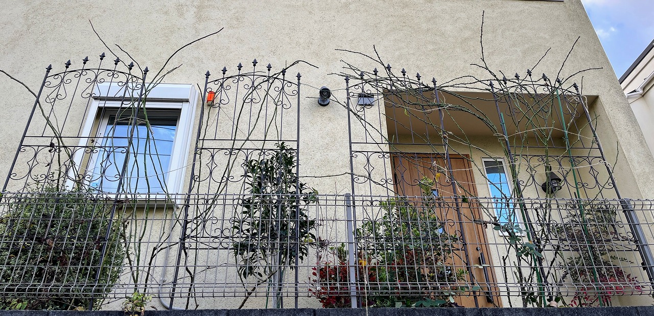 まだ剪定をしていないのだが、今のままでは二つのトレリスを使ってもはみ出しそうだ。これから休眠すればしなやかになってS字型に誘引できるのだろうか・・・その前に枝数も相当減らさないとなぁ。