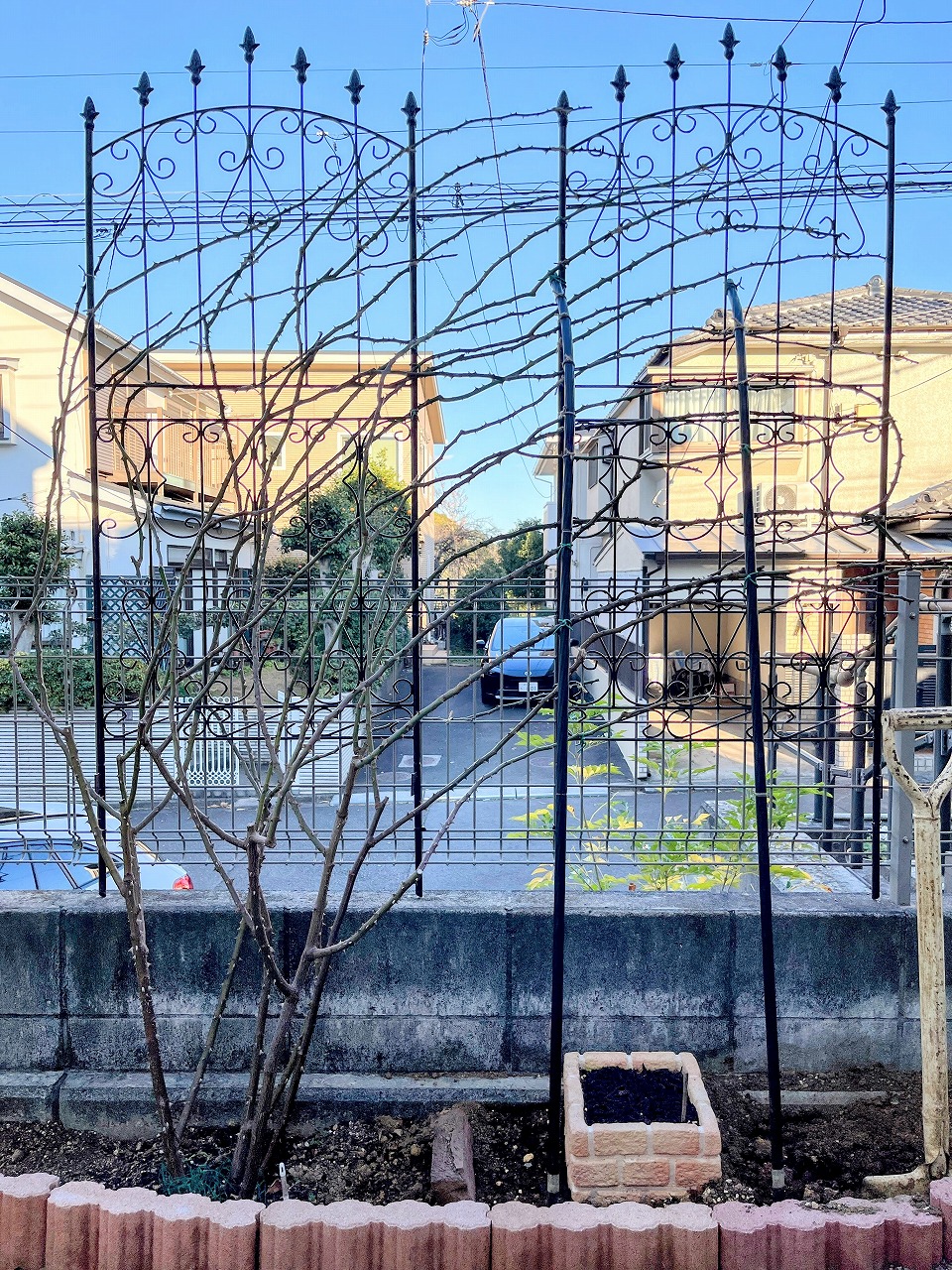 年末に購入した高級剪定ばさみを使って、とはいってもあまり切り詰めるところはなかったけど、不要な枝を切り、トレリスに止め付けていく。