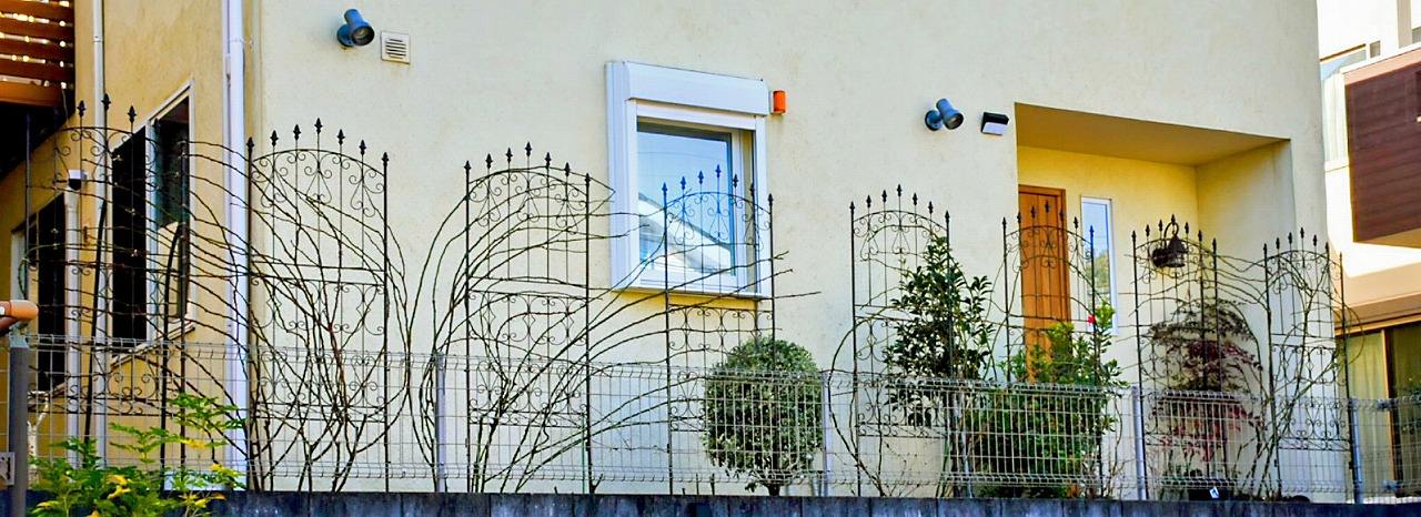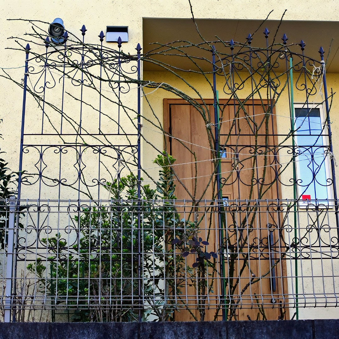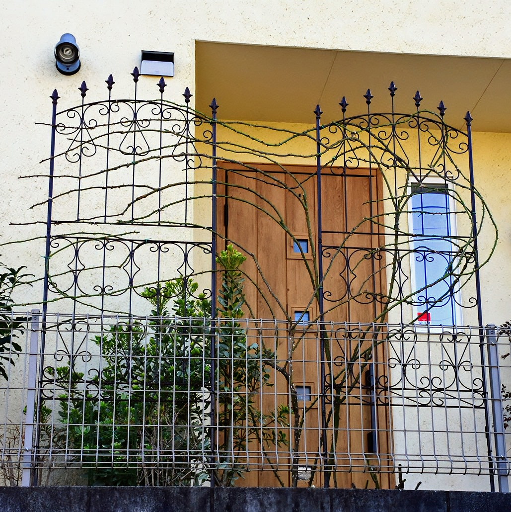 これにて今季のつるバラ、半つるバラの剪定と誘引作業は完了。