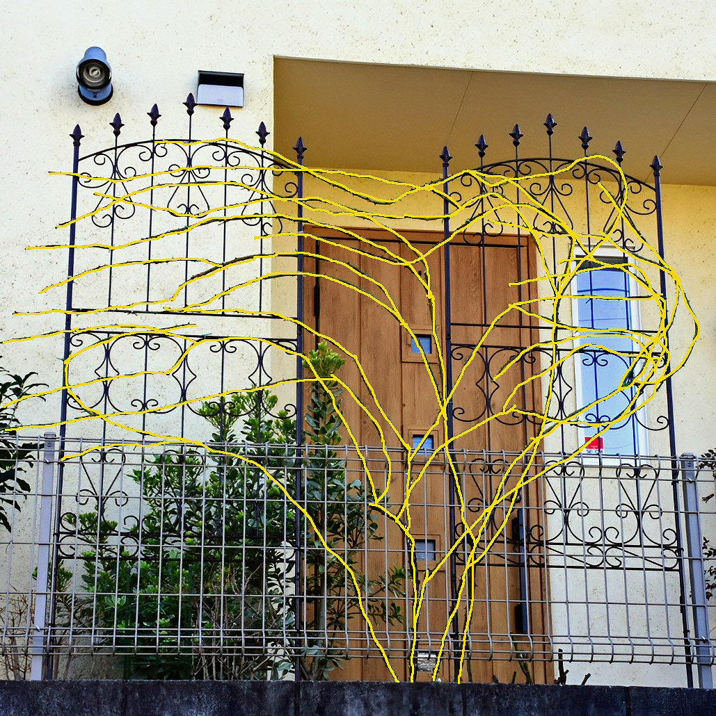 四本目と慣れてはきたのだが、ソレイユロマンティカはトゲが多い、比較的曲げにくい(=折れやすい)、枝がトレリスの裏表に入り組んでいることもあってちょっと苦労した。所要時間はやはり約3時間。